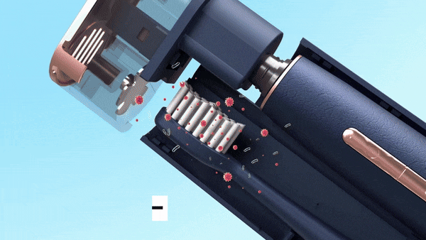ブラシを乾燥させると新鮮な状態が保たれますが、バクテリアなどの微生物がブラシ上で増殖する可能性があります。それを防ぐために、医療グレードのUV-C紫外線除菌がケース内に取り付けられ、ケースにしまうとブラシをUVクリーナーで清潔に保ちます。
