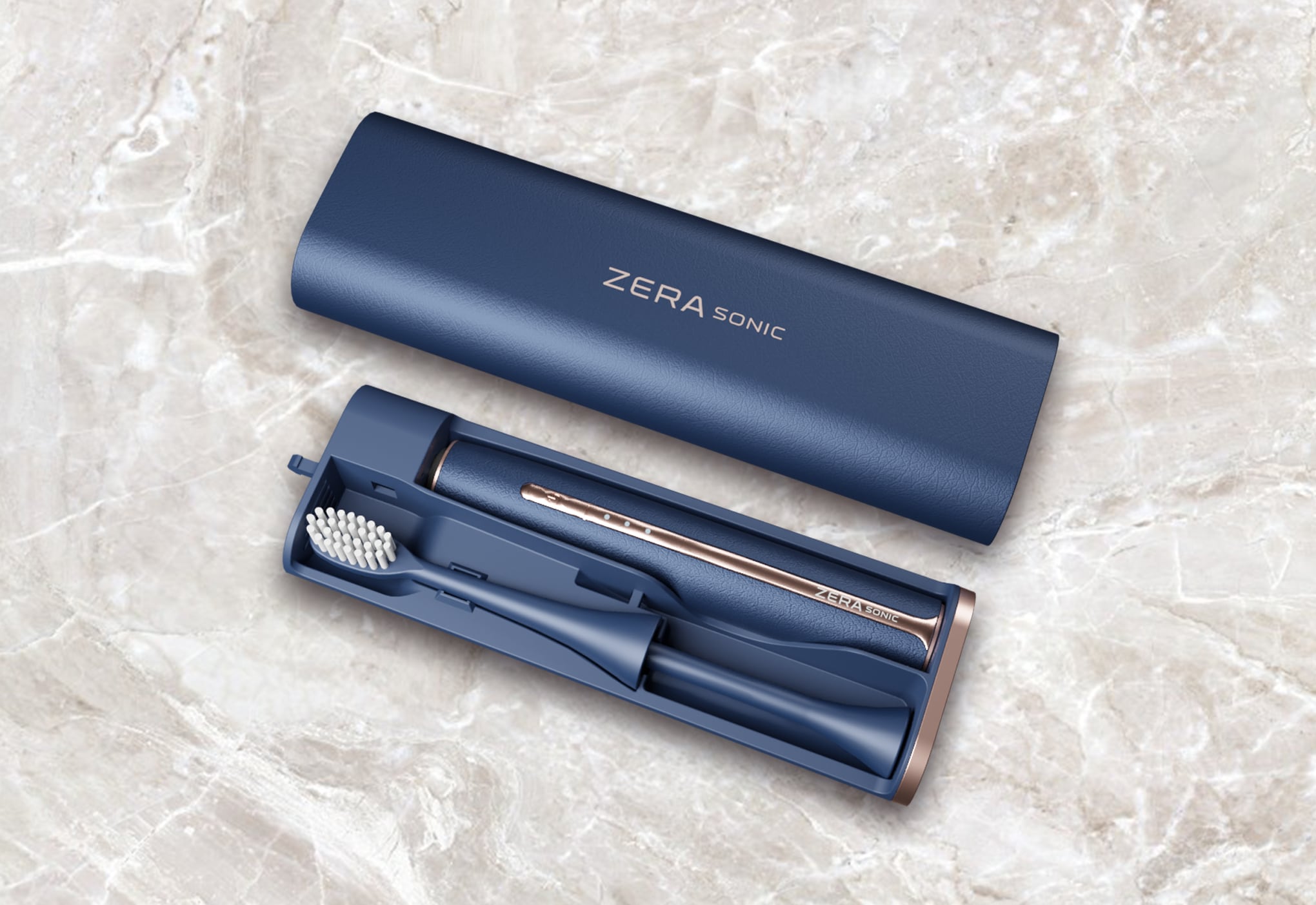 ZERA Sonicはオートケアケースにすべてが収納されているオールインワン。 洗練されたモダンなデザイン。ブラシ、ハンドル、お好みの歯磨き粉を収納できるようになっています。